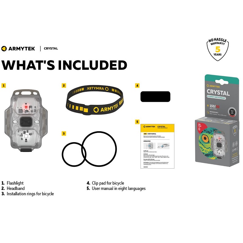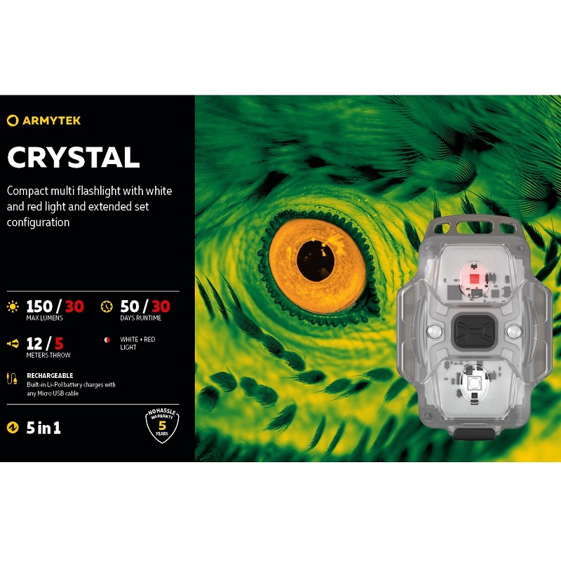 Crystal je multifunkční model s jasným červeným světlem až 30 lumenů a bílým světlem až 150 lumenů, který se snadno vejde do kapsy. Díky plně svítícímu tělu a 140° širokému záběru je baterka nepostradatelná pro každodenní použití na blízko: na jogging, cyklistiku nebo práce v garáži. Červené světlo modelu Crystal je vhodné pro provádění prací ve tmě a pro udržení nočního vidění při zapínání a vypínání baterky: v kempinkovém stanu, při pozorování hvězd, při rybolovu nebo jízdě na kole. Má také další výhodu pro outdoorové aktivity – umožňuje osvětlit oblast bez přitahování otravného hmyzu. Baterka funguje až 50 dní v režimu minimálního jasu. Není třeba dodatečně dokupovat a neustále měnit baterie: vestavěná Li-Pol baterie se nabíjí pomocí jakéhokoli Micro USB kabelu. Multifunkční baterka nezabere moc místa v batohu nebo tašce a uvolní jej na jiné věci. Model je na hlavě bezpečně připevněn gumičkou, což umožňuje dobré osvětlení při jakékoli aktivitě. Baterku lze připevnit na jakoukoli část oblečení, opasek nebo popruh batohu pro bezpečnou noční turistiku. Pomocí speciálních silikonových kroužků v sadě je Crystal bezpečně nainstalován na kole. Navíc design těla s otvorem pro přívěšek na klíče umožňuje použití multi baterky jako stylového doplňku.