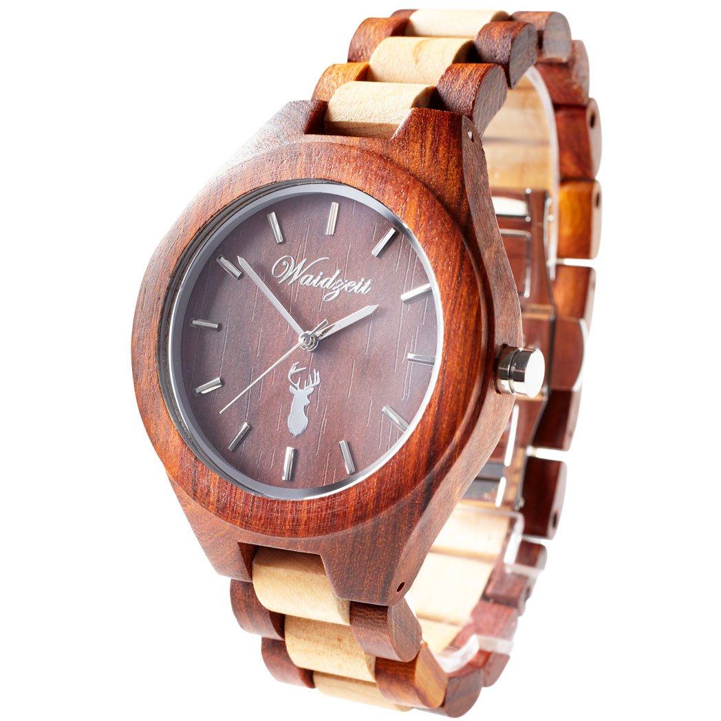 Drevené náramkové hodinky Auerhahn Platzhirsch sú vyrobené z pevných odrôd dreva. Konkrétne z javorového a santalového dreva, ktoré je obzvlášť známe svojou odolnosťou. Klasický okrúhly ciferník možno považovať za nadčasový. Detaily, akými sú ručičky a logo jeleňa z chirurgickej ocele dotvárajú celkový dizajn hodiniek.