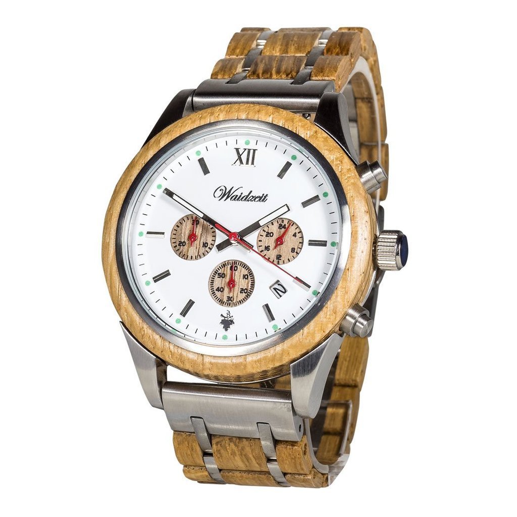 Multifunkčný chronografický ciferník je doplnený o tri ďalšie malé ciferníky na bielom podklade. Dubové drevo je skombinované s chirurgickou oceľou v striebornej farbe. Hodinky pôsobia športovo a elegantne zároveň. Masívne, no ľahké a pohodlné na každodenné nosenie. Dokonale ozdobia ruku každého vinára srdcom aj dušou.