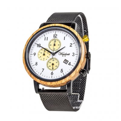Gin ako nápoj s výraznou arómou sa stal nepostrádateľným v našich zemepisných šírkach. Niet divu, že sme to vo Waidzeit sme na výrobu hodineik Gin podľa chuť. Okrem nápadne krásneho dizajnu a spracovania je puzdro ciferníka týchto drevených hodiniek vyrobené z recyklovaných dubových sudov. Drevené hodinky chronograf „Gold“ majú žlté prvky na číselníku a zlatú korunku. Gin hodinky od Waidzeit by mali zdôrazniť čas na niečo zvláštne a zdôrazniť hodnotu pre remeselnosť, udržateľnosť a radosť!