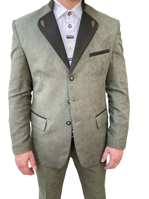 1-radový, 3-gombíkový oblek z umelého velúru s lodenovým golierom.