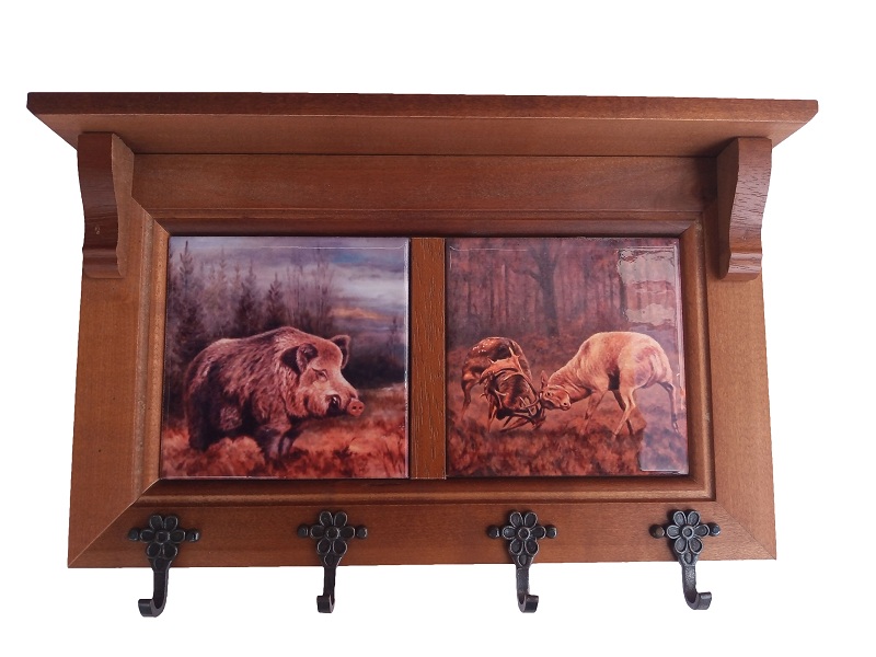 Vešiak je vyrobený z dreva a obsahuje keramické kazety so zvieracími motívmi.