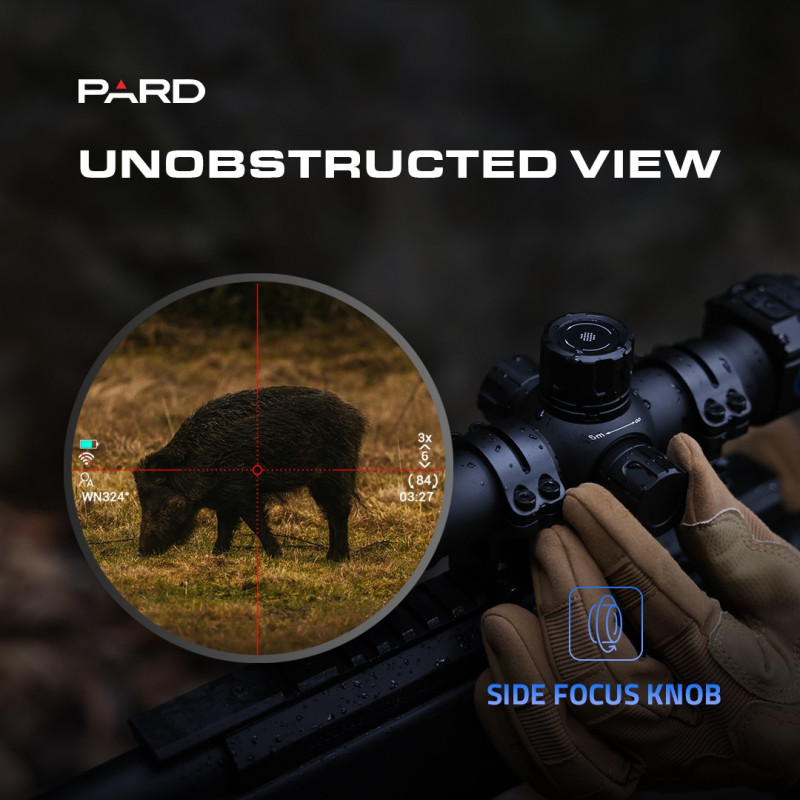 Boční ostřící kolečko je navrženo tak, aby neblokovalo zornou linii na cíl ani nerušilo vizuální zážitek, čímž zlepšuje celkovou použitelnost. Jeho umístění na boku zajišťuje snadnou dostupnost a vynikající ovladatelnost, ať už je zbraň držena v ruce nebo upevněna na stativu.