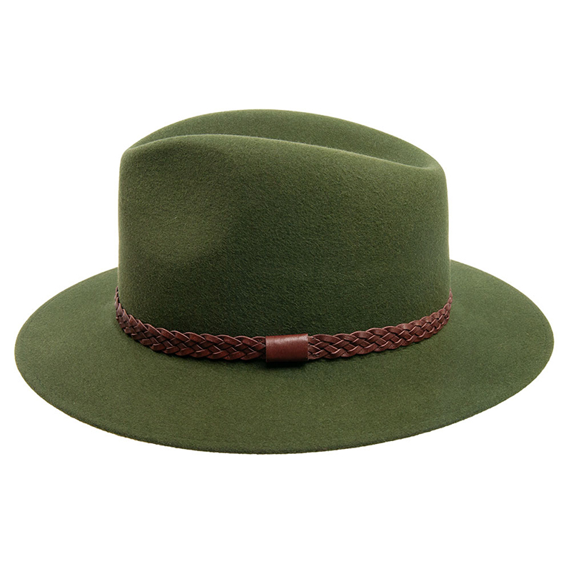 Poľovnícky klobúk s koženým potným pásikom zdobený koženým prepletaným remienkom. Šírka okraju: 6 - 6,5 cm.Farba: zelenáZloženie: 100% králičia srsť