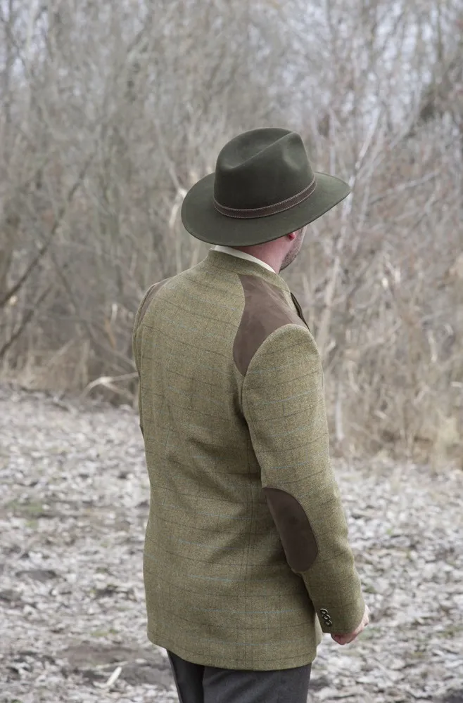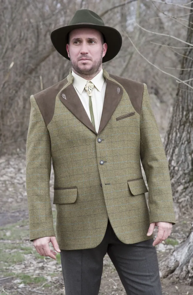 Prvotřídní materiál zelené barvy s hnědým károváním je doplněn imitací kůže z hnědého veluru na klopách, ramenech a lemování kapes. Z imitace kůže jsou také záplaty na loktech na rukávech.