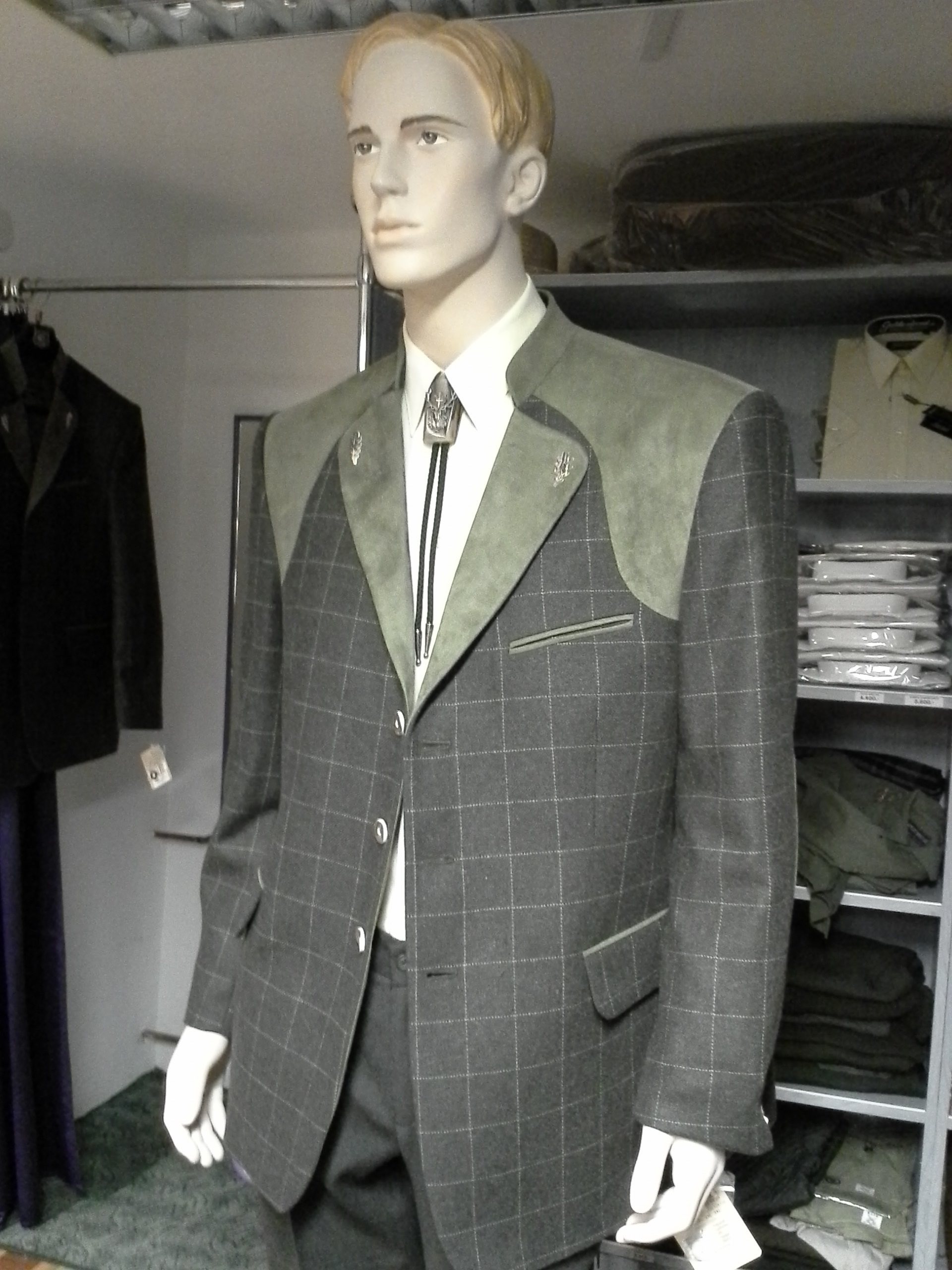 Sako s velúrovým golierom, ramenami a lakťovými záplatami.