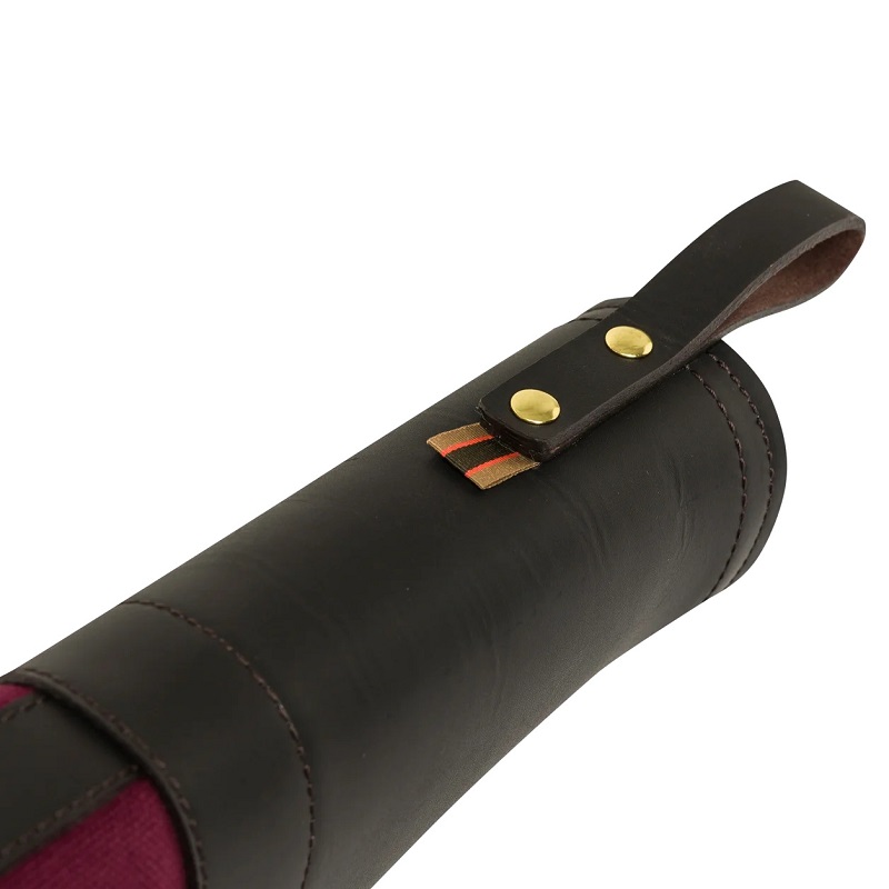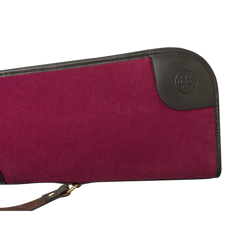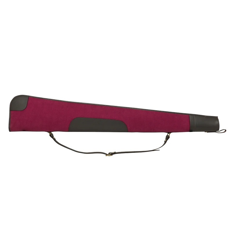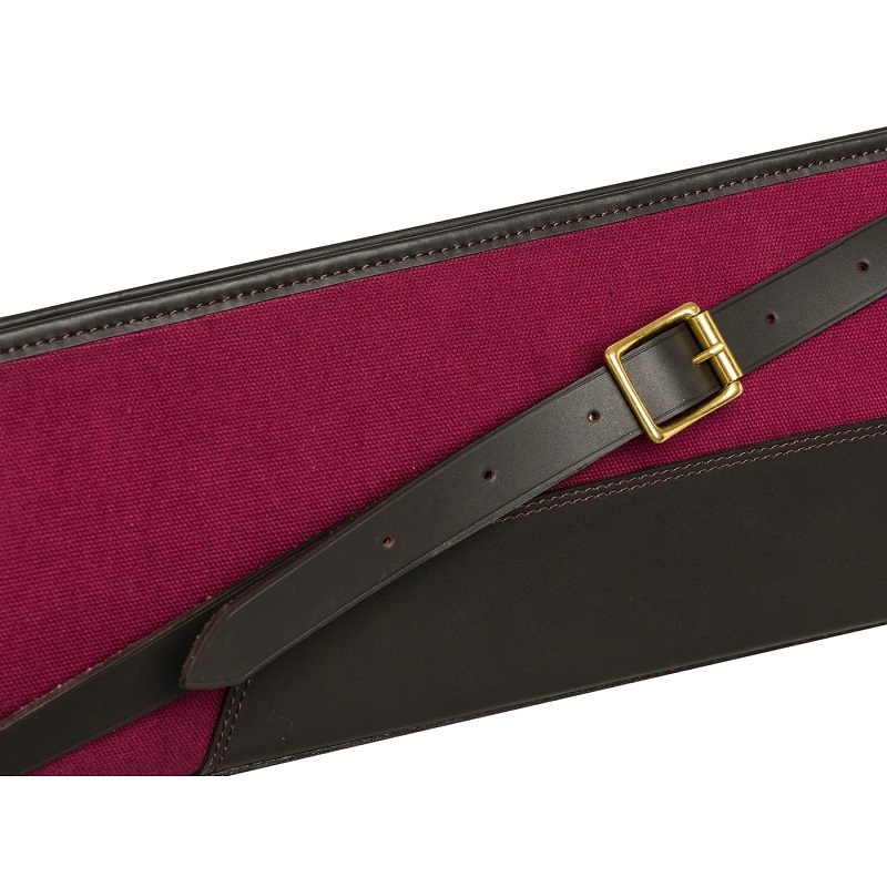 Jednoduché pouzdro na odstřelovací pušky s hladkým vývrtem vyrobené z bavlněného plátna a panelů z pravé kůže. Zapínání na zip. Vnitřní podšívka z umělé kožešiny bílé barvy. Starší mosazné doplňky, spony a nýty.