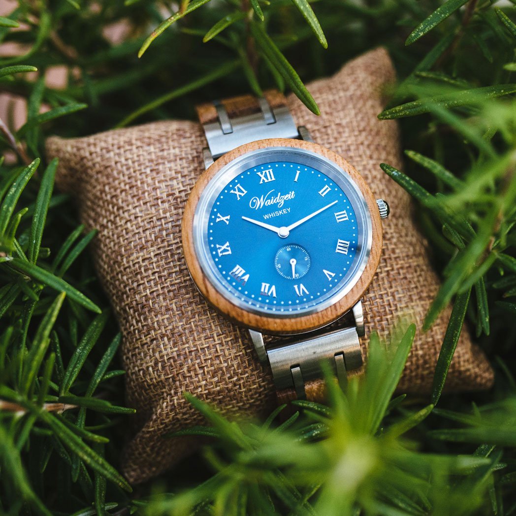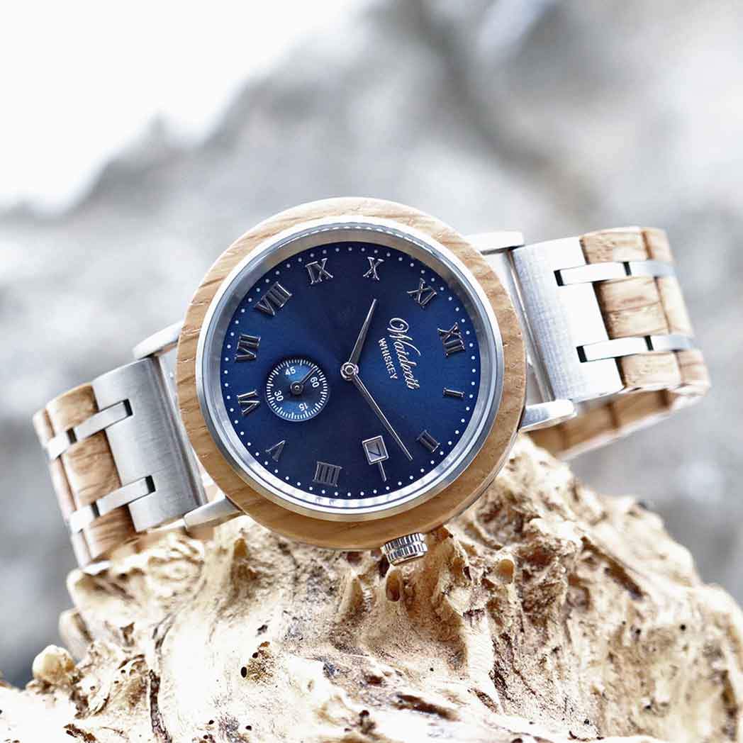 Tmavě modrý ciferník vytváří v kombinaci se světlým dřevem jedinečný kontrast. Náramek, stejně jako ciferník hodinek, doplňují prvky z chirurgické oceli, které jim dodávají pevnější vzhled. Model, který je ideální pro muže s vysokými nároky. Ciferník je vybaven vteřinovou ručičkou a ukazatelem data, díky čemuž neunikne vaší pozornosti žádná důležitá událost. Dubové dřevo je známé svou odolností a pevným materiálem, který vám vydrží v nezměněné podobě dlouhá léta. Hodinky Whisky James od značky Waidzeit můžete nosit navždy, protože jejich jedinečný a nadčasový design vás nikdy neomrzí.